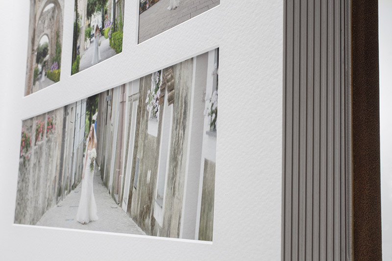 The aperture will be 1/3 of inch smaller than the actual dimensions of the image in order to ensure the perfect superimposing of the mount on the perimeter of the image. The Matted Album with thin mounts can include up to 60 pages (30 double spreads), the one with bevel mounts up to 40 pages (20 double spreads).