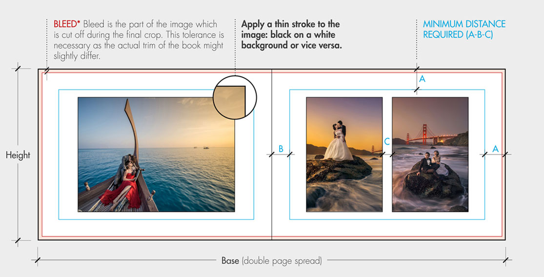 In the Matted Album, a thin or beveled mat is applied over the page of printed images. The process of cutting the mat openings is done with maximum precision to correspond to the layout of the images. The layout is not subject to any fixed template and can be prepared with any software, Photoshop and InDesign included, by simply applying a thin border around the images per the specifications below. Files can be uploaded as PDFs or JPEGs (see our Print & Bind document for all the relevant details). By using Graphisoftware 6.2.0, you can design the Matted Album as you would any of our other books, simplifying the process (see Graphistudio 6.2 pdf).