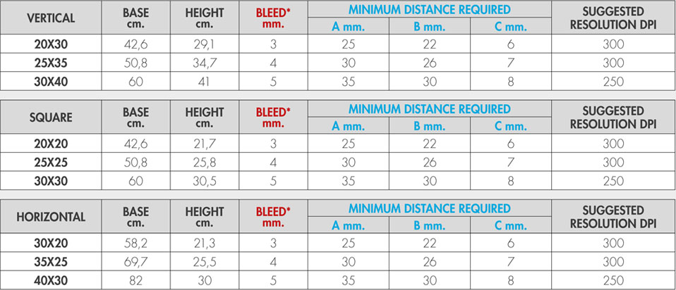 Horizontal: 12×8; 13×9.5; 16×12 (30×20; 35×25; 40×30 cm).