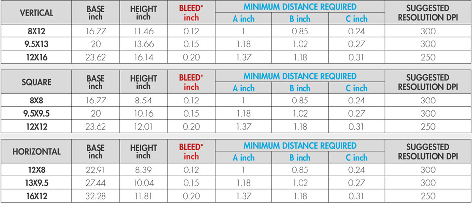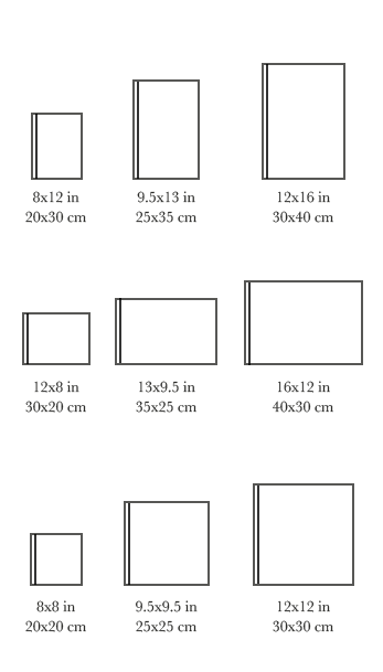Flush mount (continuous binding) 4×5” (10x13cm), 6×8” (15x20cm), 8×12” (20x30cm) vertical, square and landscape.