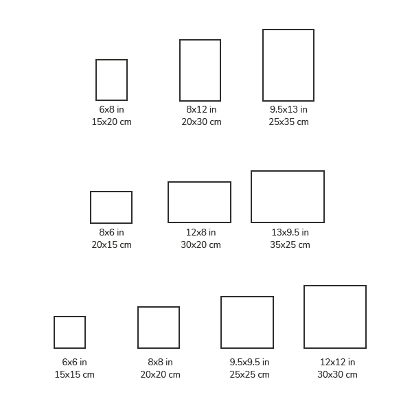 Horizontal: 8×6″, 12×8″, 13×9.5″ (20×15, 30×20, 35×25 cm);