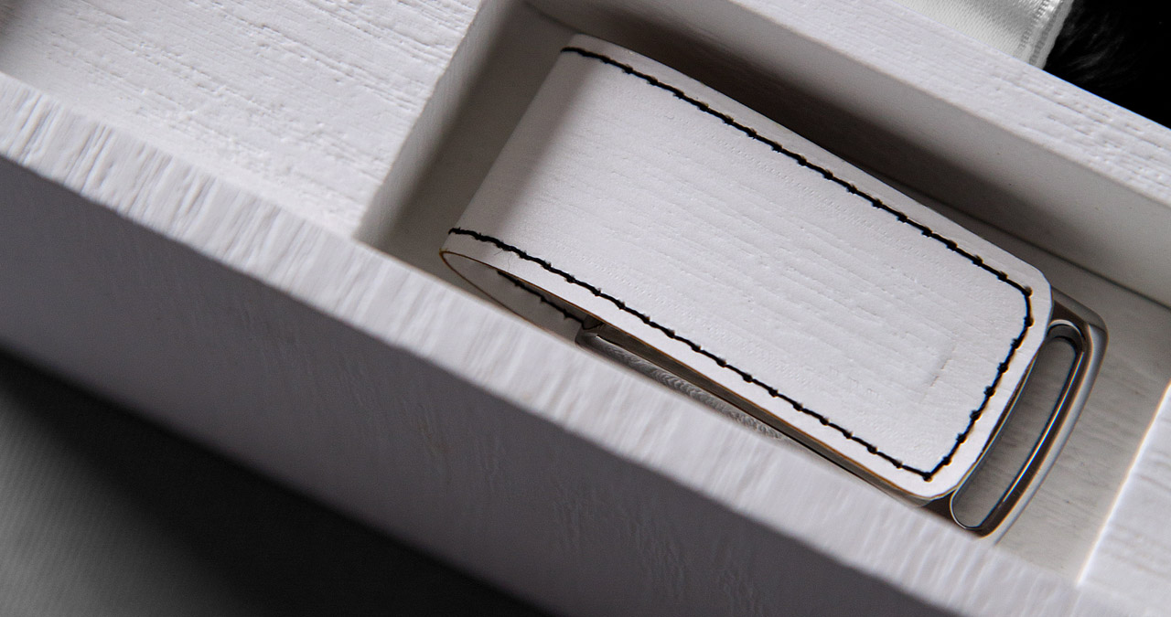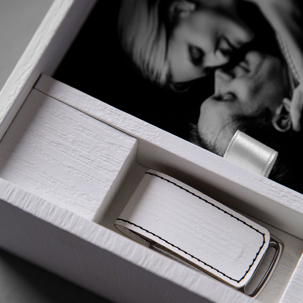 4GB, 8GB, 16GB, 32GB or 64GB. Flap in standard white leather or any material available for the box.