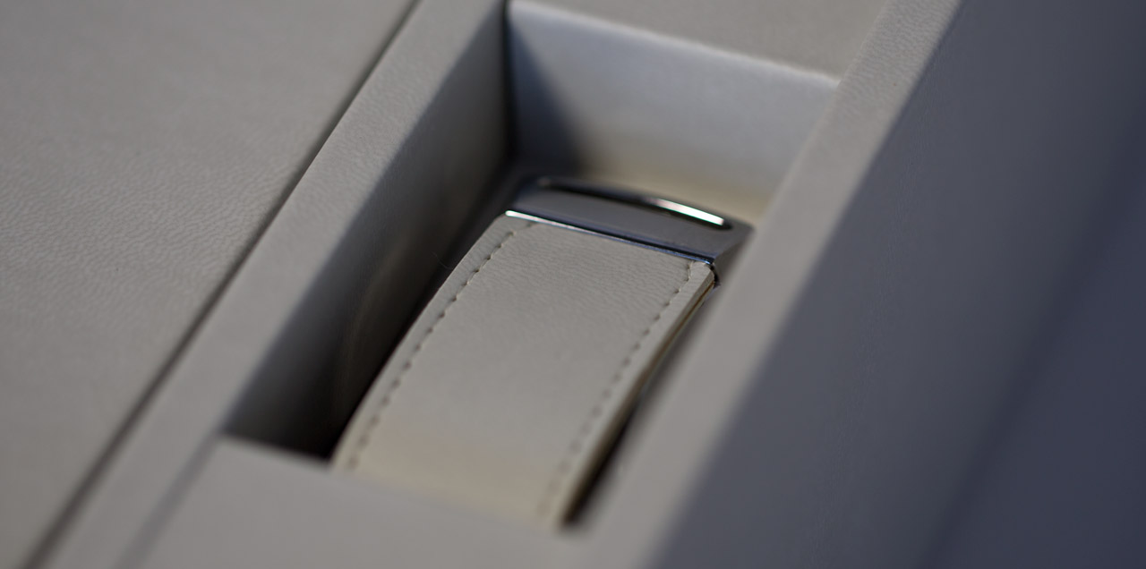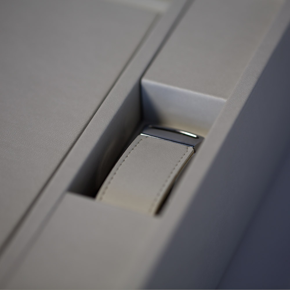 Flap in standard white leather or any material available for the box.