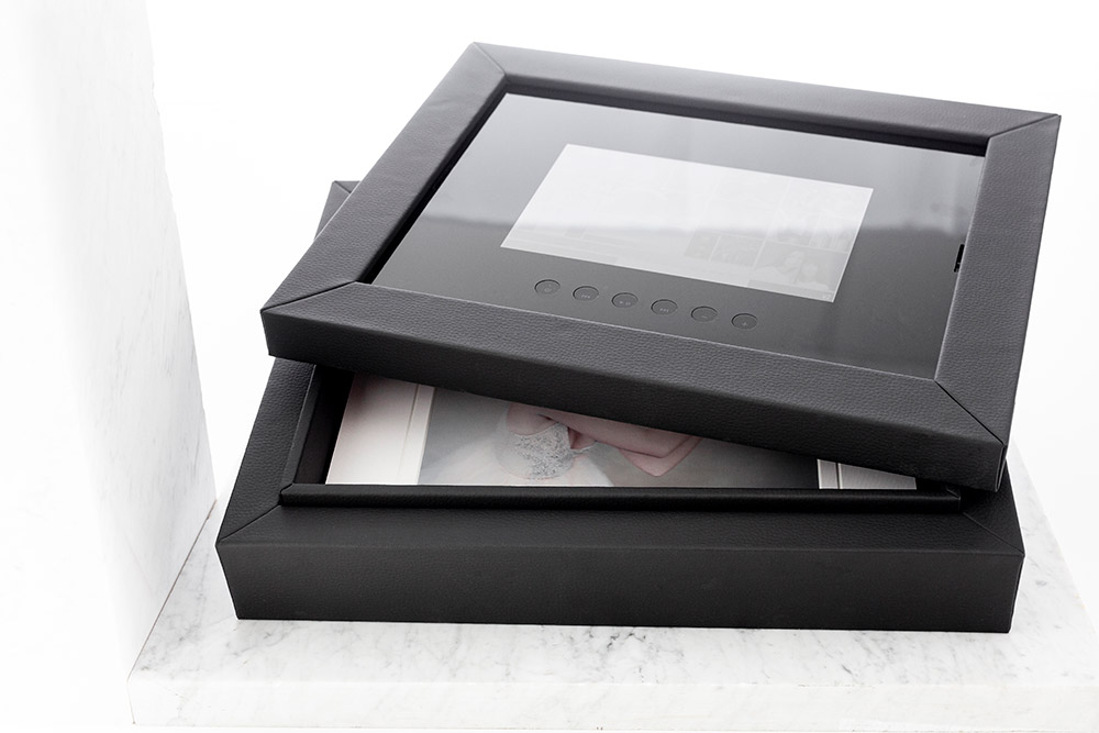 The Reveal Box .MOV does feature all the materials, colors and options of a regular Reveal Box. Thanks to 2GB/4GB solid memory you can play videos, slideshows and music at will! The enhanced time capsule to keep all your clients memories and emotions in one place.