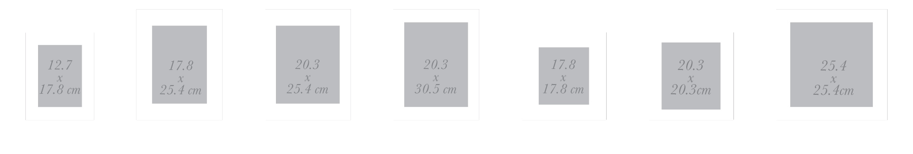 Sizes in centimetres: 20.3×25.4cm with an opening for a 12.7×17.8cm print. 27.9×35.5cm with openings for 17.8×25.4cm, 20.3×25.4cm, 20.3×12” prints. 25.4×25.4cm with openings for 17.8×17.8cm, 20.3×20.3cm prints. 35.5×35.5cm with openings for 25.4×25.4cm prints.