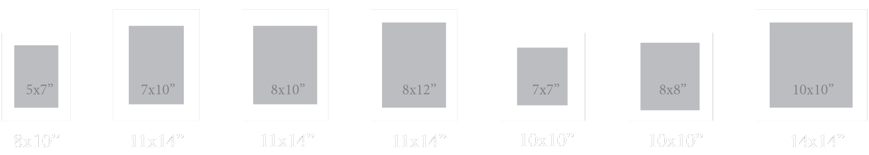 Sizes in inches: 8×10” with an opening for a 5×7” print. 11×14” with openings for 7×10”, 8×10”, 8×12” prints. 10×10” with openings for 7×7”, 8×8” prints. 14×14” with openings for 10×10” prints. Thickness: regular 0.11” / bold 0.18”.