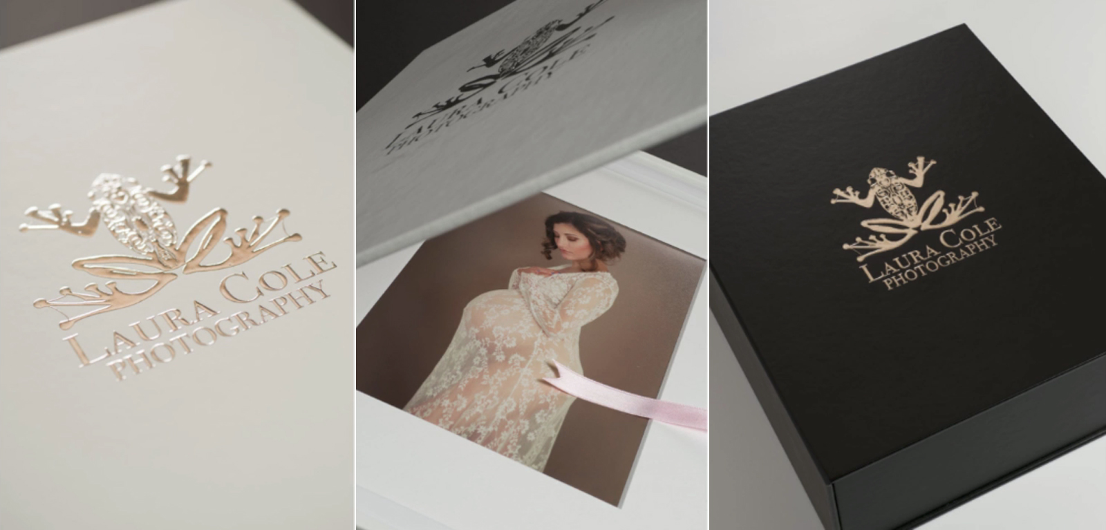 The power of personalization is key to make every Folio Box unique. Here you can see an extremely iconic logo design for powerful branding, in silver on white leatherette and golden on black leatherette raised foil.