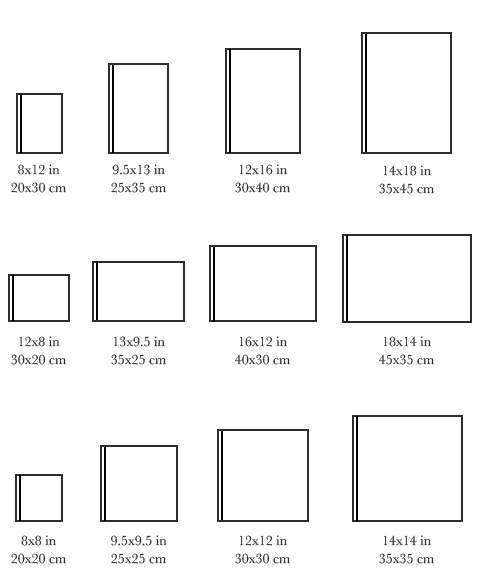 Flush mount (continuous binding) 4×5” (10x13cm), 6×8” (15x20cm), 8×12” (20x30cm) vertical, square and landscape.